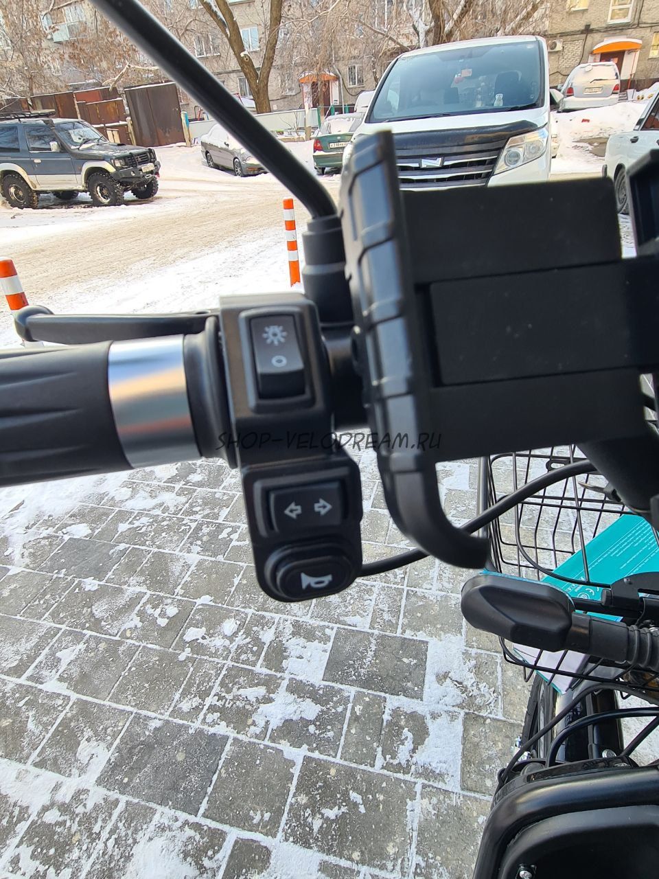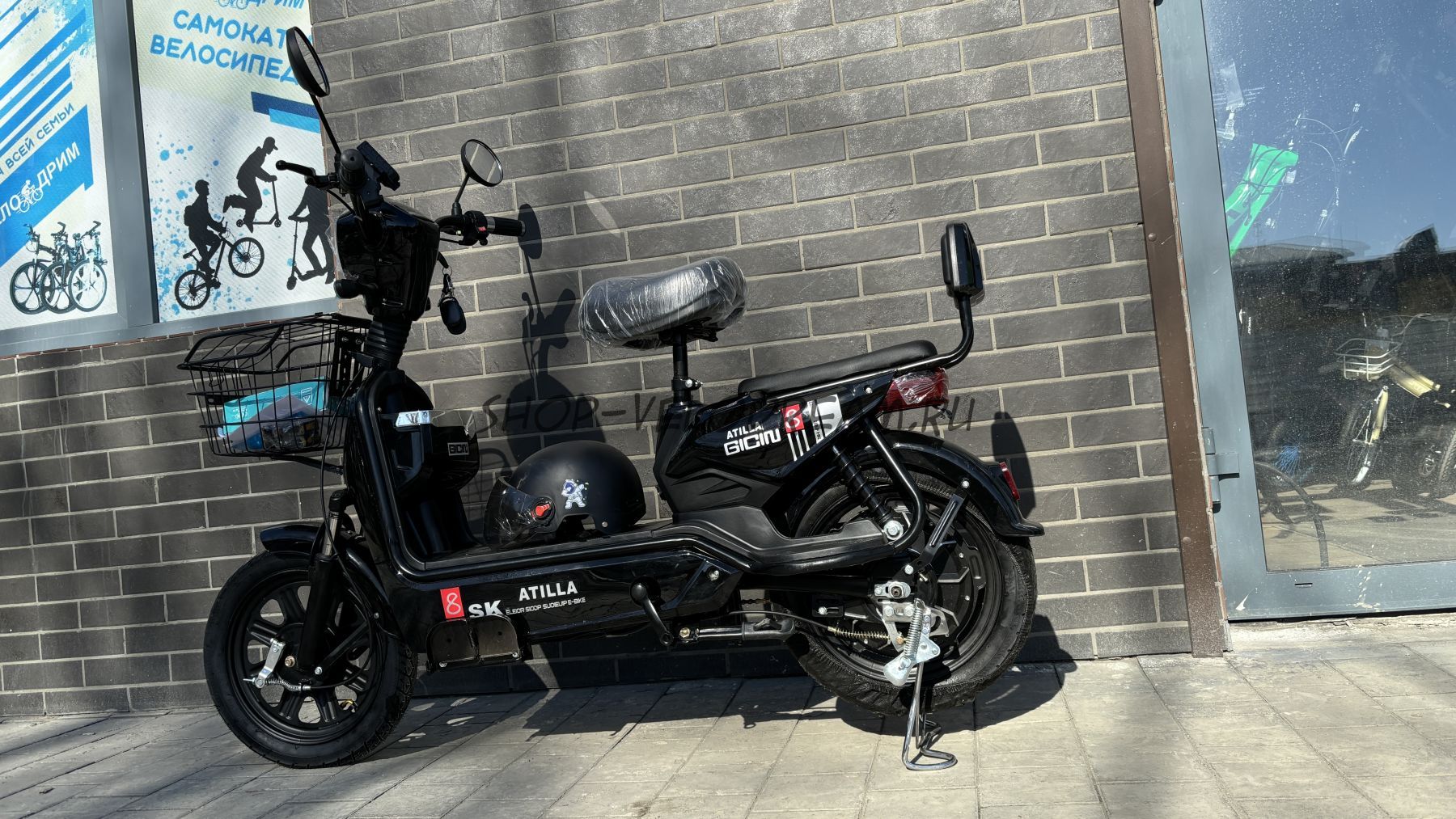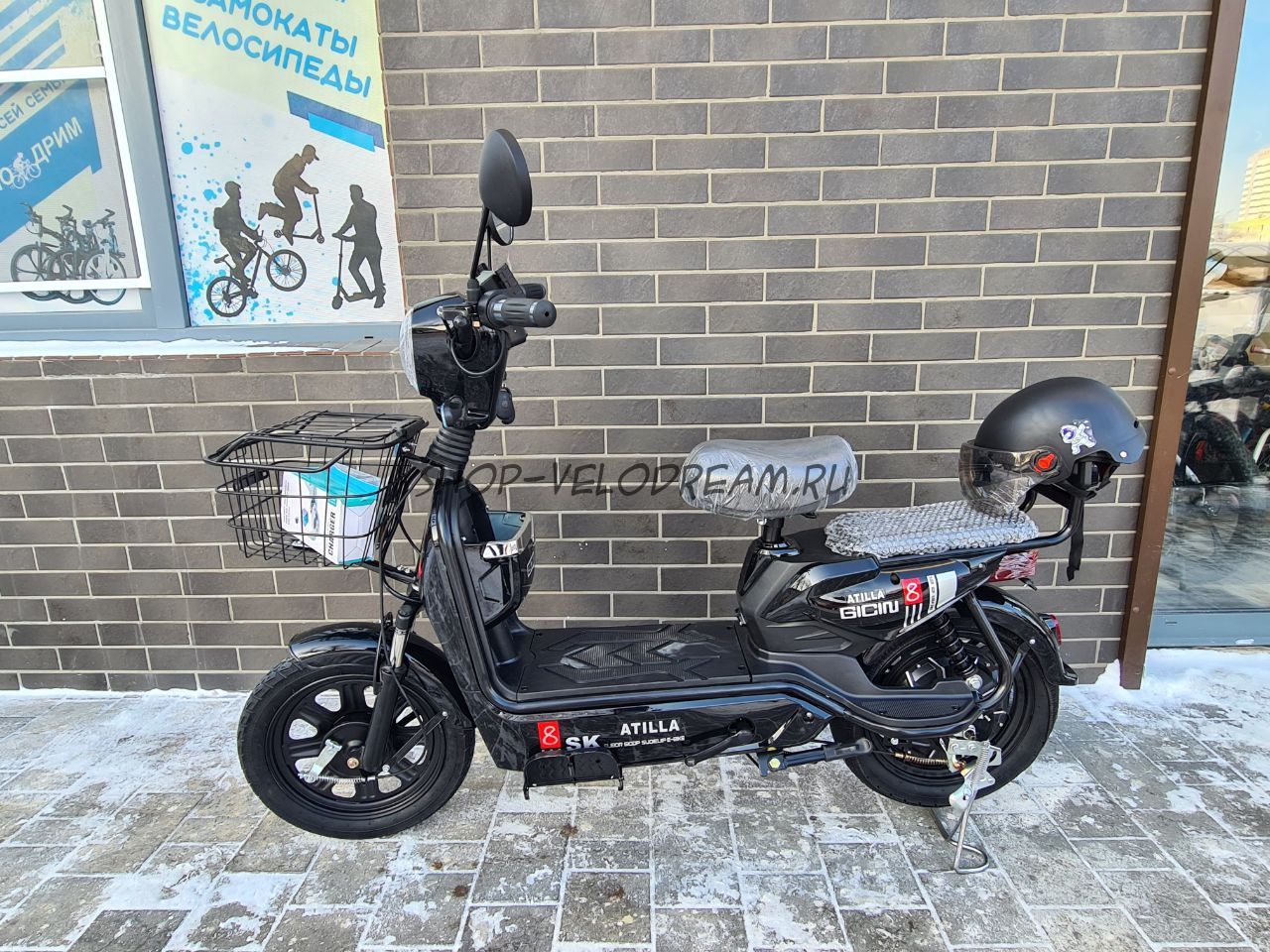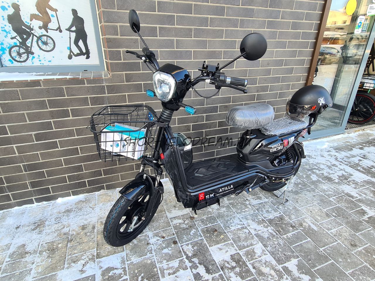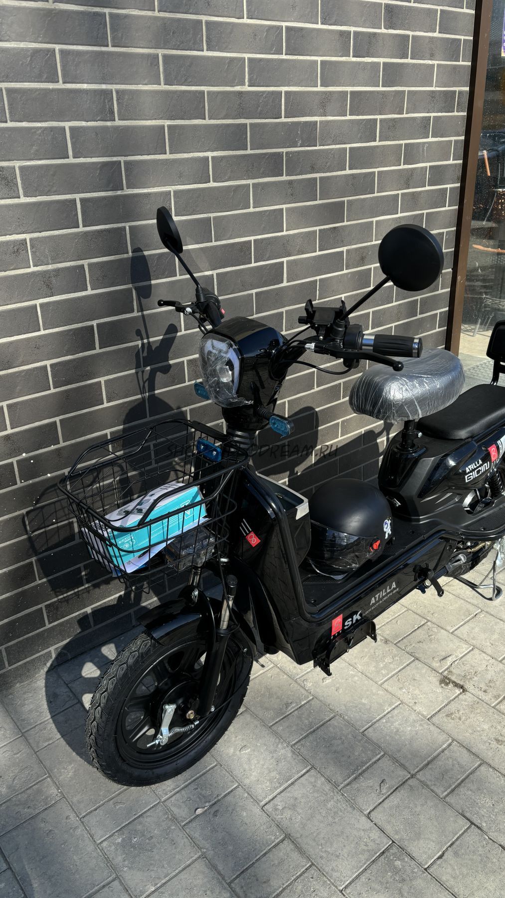 Комплектация включает: Корзину, зеркала заднего вида, держатель телефона с USB, зарядное устройство и шлем.